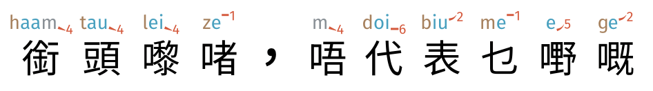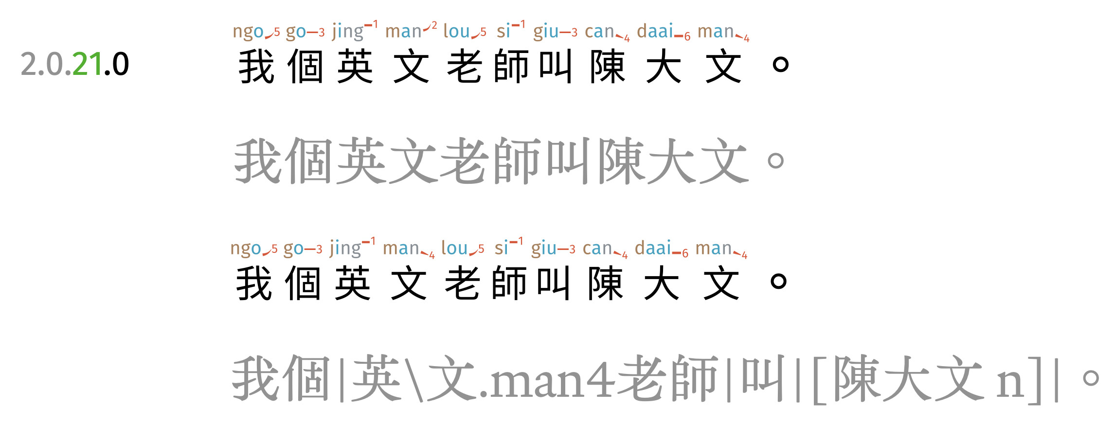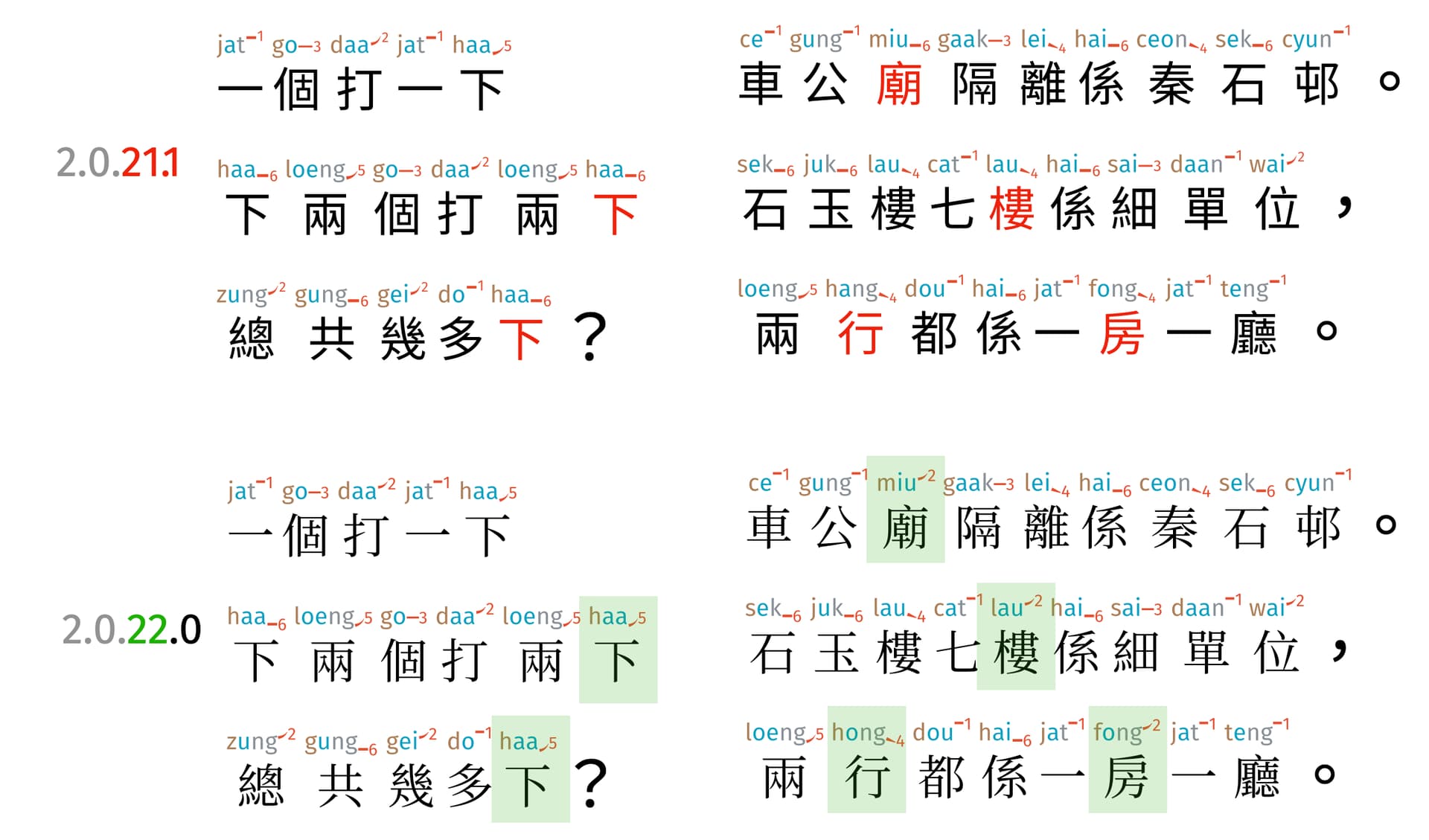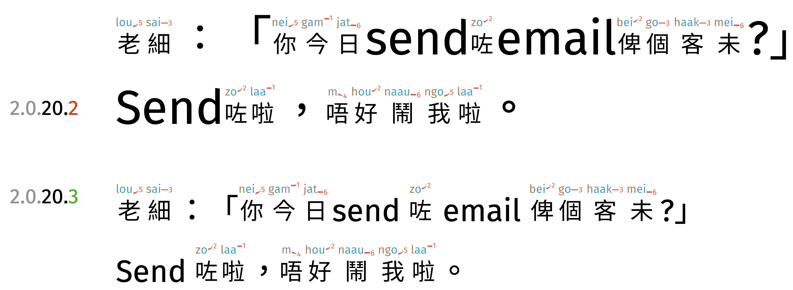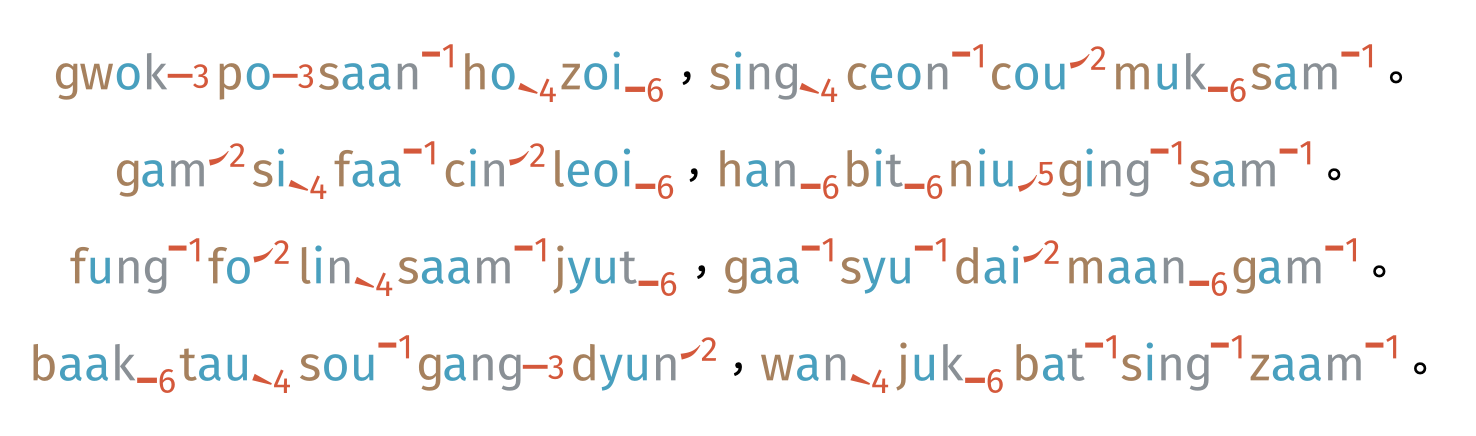 All-in-all this is a very interesting and important solve to the “ugly Jyutping-annotated text” problem that I’ve been chasing down for two years, and I’ve started a blog post on its evolution. From the user’s perspective… it just looks nice, natural, and rhythm-preserving. “Do nothing” is hard.