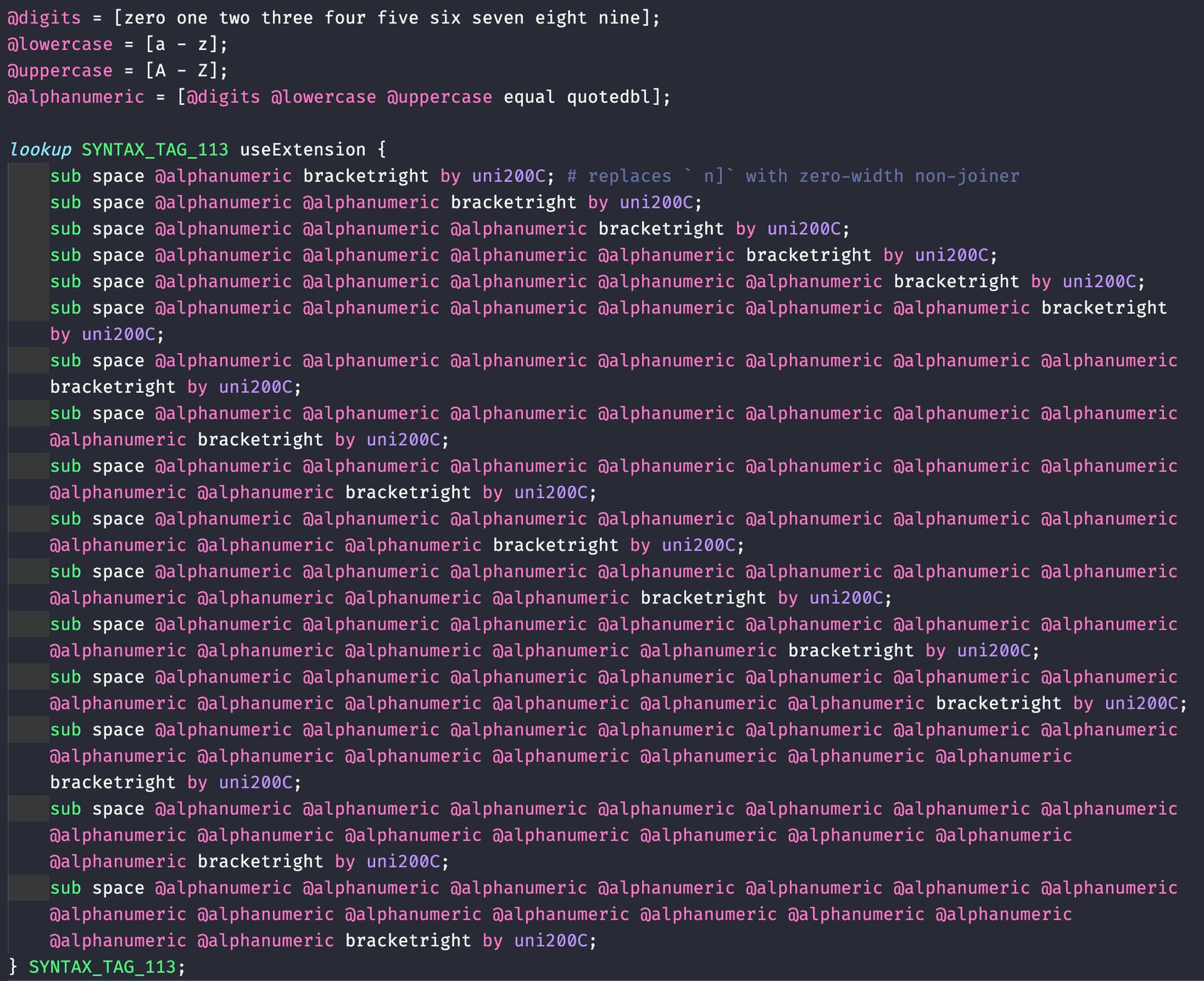 Significant work (with help from @k.k) went into trying to make .jyutping override work on Microsoft shapers. This included making three additional set of rules where full-width characters were also accepted, in attempts to help the renderer NOT break the ligature up into separate runs. None of the attempts worked.