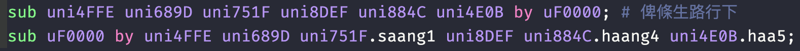 One of the problems of relying onExCantonese is that the library’s data may change over time. Say the default reading for 洱 is lei2 right now; but someone managed to persuasively argue for ji5 and we changed the default to that. Interpretation of the dry-formatted 普洱|加|檸檬|變|檸茶 will now be different from what you intended, and that’s… no good.