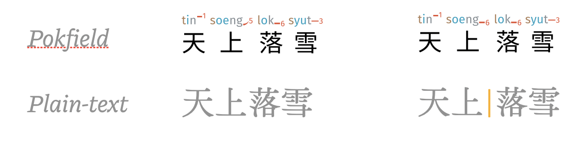 In some cases, the incorrect suggestion comes from the font perceiving a different context than the user intended. For example, in the phrase 天上落雪, the font sees 上落 as one unit, and provides soeng5 as the pronunciation. The user can guide it by marking out the boundaries of words using the | pipe/bar symbol (often found above the Enter key). This | symbol is a private language for the user to interact with Pokfield invisible in the font and does not introduce any additional spacing issues.