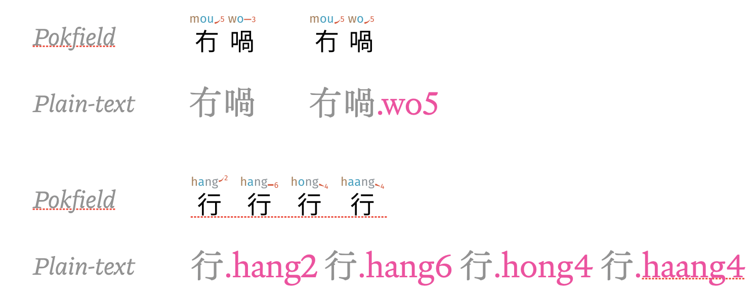 Cantonese pronunciations often cannot be inferred from the written script: 冇喎 can mean “but there is none” (when wo3 is uttered) or “I am skeptical that there is none” (when wo5 is uttered). There is nothing for Pokfield to use to infer a reading.