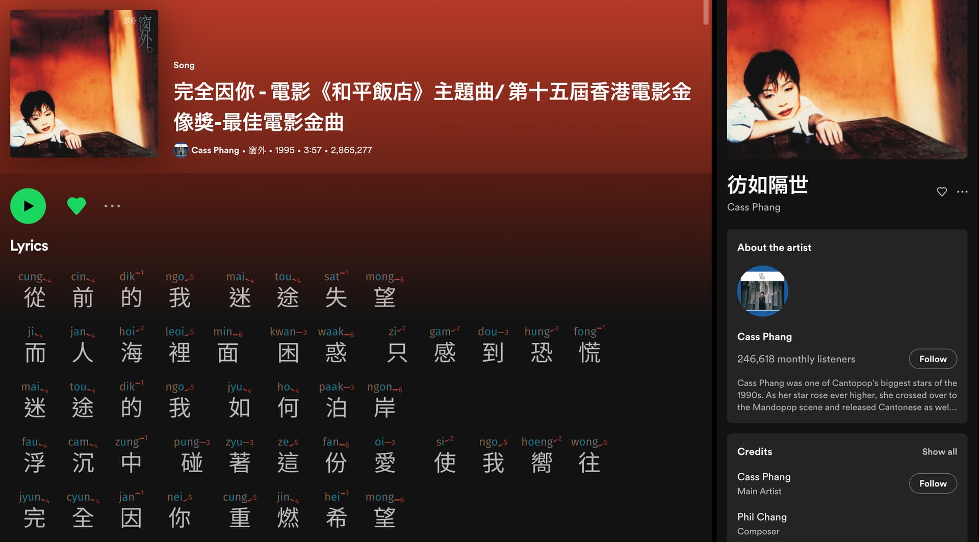 Using the Cantonese Fonts, you can read all the Chinese lyrics with Jyutping when listening to Spotify on web browsers. The process is the same as using the Cantonese Font for any other website.